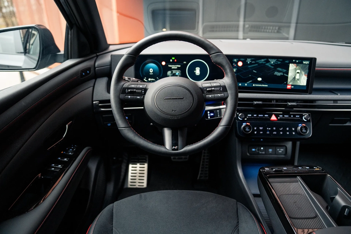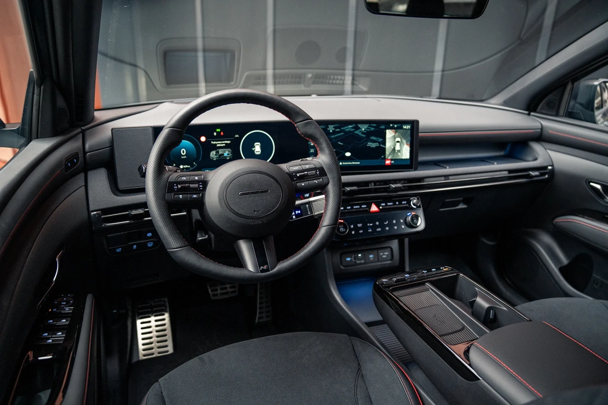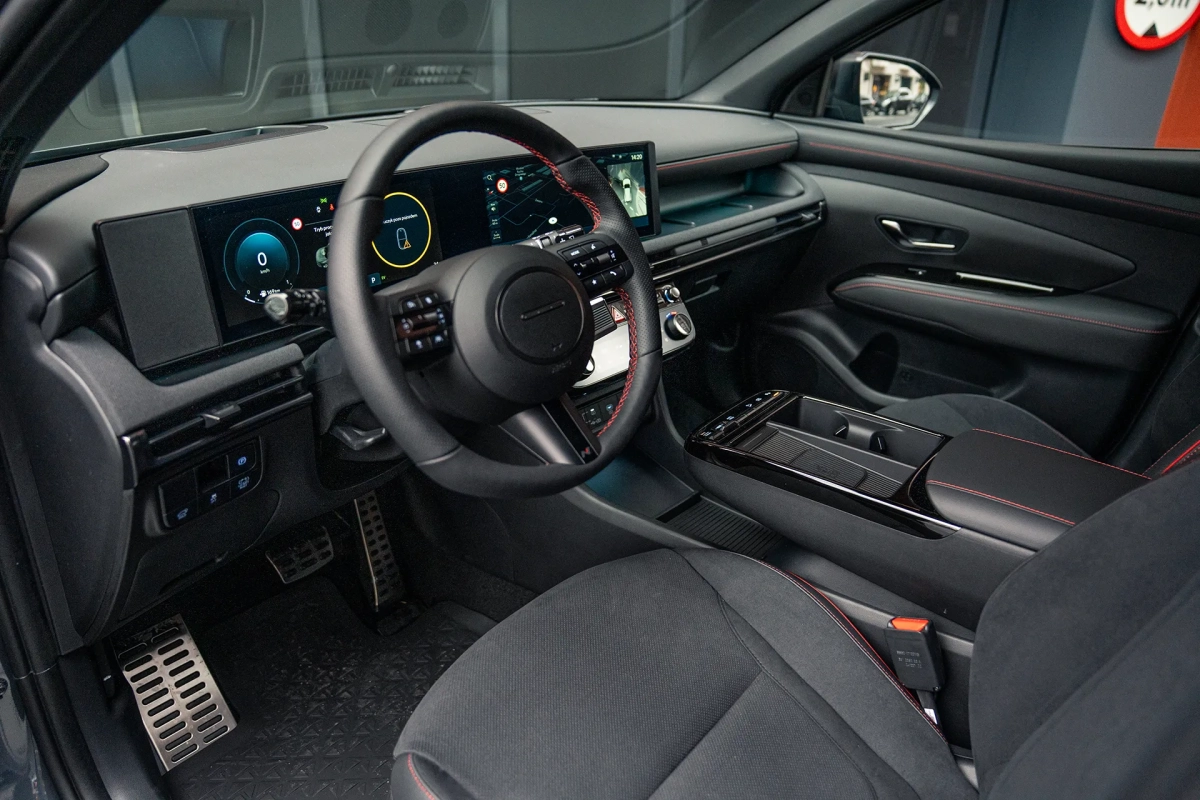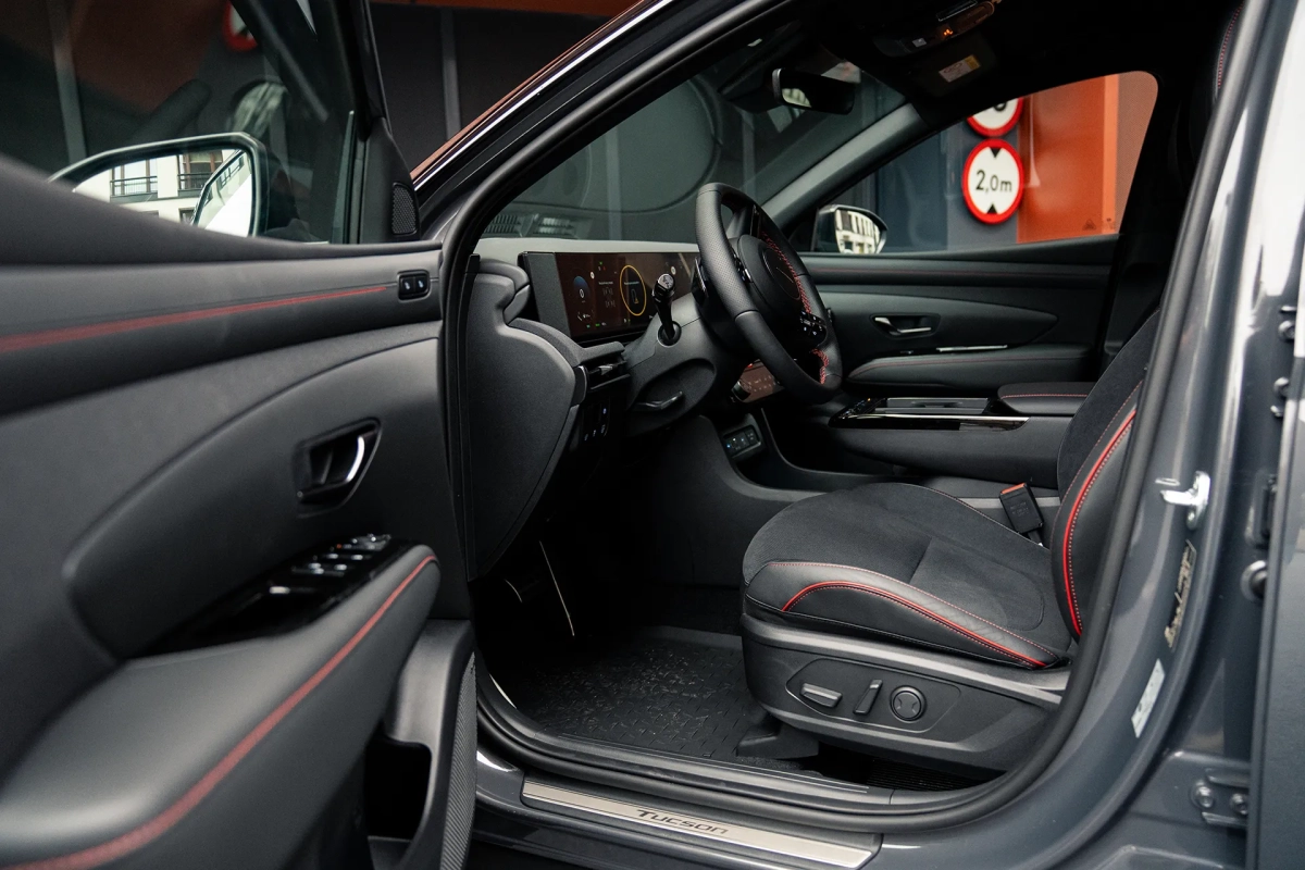 DESIGN Package LED Matrix Headlights (IFS), Two-Tone Bodywork with Abyss Black Roof LUXURY Package Power-adjustable front seats with driver's memory, heated rear seats, ventilated front seats, driver's seatback magazine holder (net), passenger seatback magazine holder (net), Reverse Collision-Avoidance Assist (PCA), Head-Up Display, front, rear, and side parking sensors, 360° Camera System, Blind Spot Monitor (BVM), KRELL Premium Audio System, tweeters, external amplifier, and center speaker. Key features of the new 2025 Tucson N Line: 1. Sporty N Line styling package – bumpers, dark chrome grille, rear spoiler, side moldings. 2. 19-inch N Line alloy wheels – dynamic design, premium appearance. 3. Leather and suede upholstery with red stitching – interior style and comfort. 4. N Line heated sports seats – improved lateral support and comfort on the road. 5. Dual 12.3-inch screen (digital dials + multimedia screen) – modern controls and navigation. 6. Apple CarPlay and Android Auto – wireless smartphone connectivity. 7. Rearview camera + front/rear parking sensors – easier maneuvering. 8. Lane Keeping, Blind Spot, and Highway Driving Assist (HDA) – top-notch safety. 9. LED headlights + LED daytime running lights – excellent visibility and design. 10. N Line heated leather steering wheel + metal pedals – a sporty interior.Im Preis inbegriffen